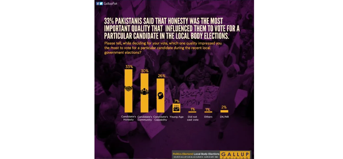 According to a Gilani Research Foundation Survey carried out by Gallup Pakistan, 33% respondents said a candidate’s honesty was the most important quality that influenced them to vote for that particular candidate in the recent local body elections.