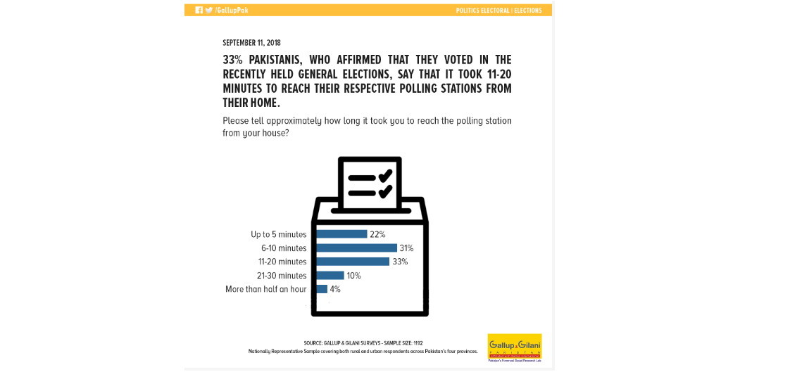 According to a Gilani Research Foundation study on “Experience of Voters during General Elections 2018” carried out by Gallup & Gilani Pakistan, 33% of the Pakistanis who affirmed that they have voted in the 2018 general elections said that it took them approximately 11-20 minutes from their homes to reach their respective polling stations.
