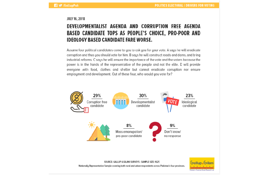 According to a Gilani Research Foundation Survey carried out by Gallup & Gilani Pakistan, developmentalist agenda and corruption free agenda-based candidate tops as people’s choice, pro-poor and ideology-based candidate fare worse.