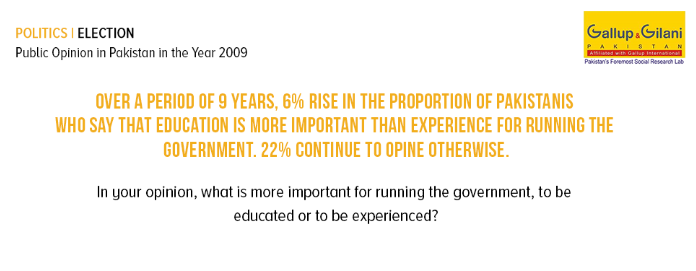 According to a Gallup & Gilani Pakistan National Survey conducted in the year 2009 (9 years ago) respondents in Pakistan were asked “In your opinion, what is more important for running the government, to be educated or to be experienced?” In response, 34% said to be educated, 17% said to be experienced, 48% said both side by side and 1% did not give a response.